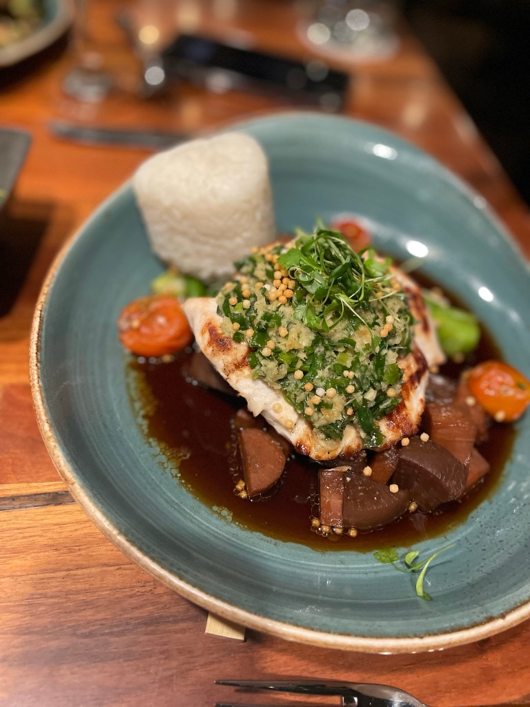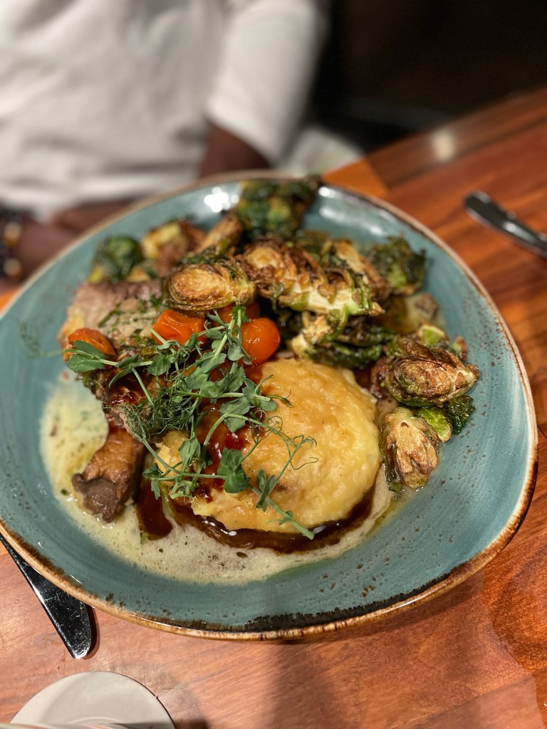 My friends had the Mahi Mahi made how you like. The restaurant gives you the option to select a fish and have it prepared how you’d like with a sauce of your choice. She got the ginger vinaigrette and I must say that was the perfect pairing for the fish. I had a bite and the best part for me was the small bits of ginger that were included. The burst of flavor in the roof of your mouth and on your tongue really helped to bring out the flavors of the Mahi Mahi, which is generally light in flavor. Our other order was a steak accompanied with mashed potatoes and grilled smashed brussels sprouts. The sprouts had a good char and helped to balance out the creamy flavor of the mashed potatoes that complimented the steak well.