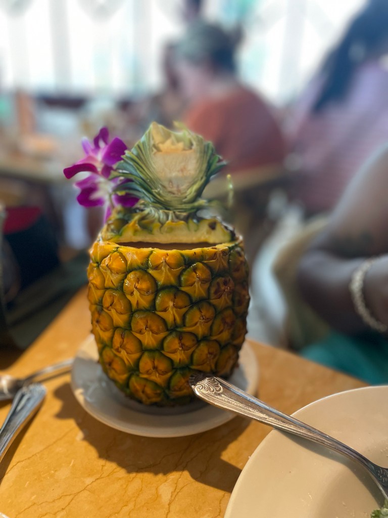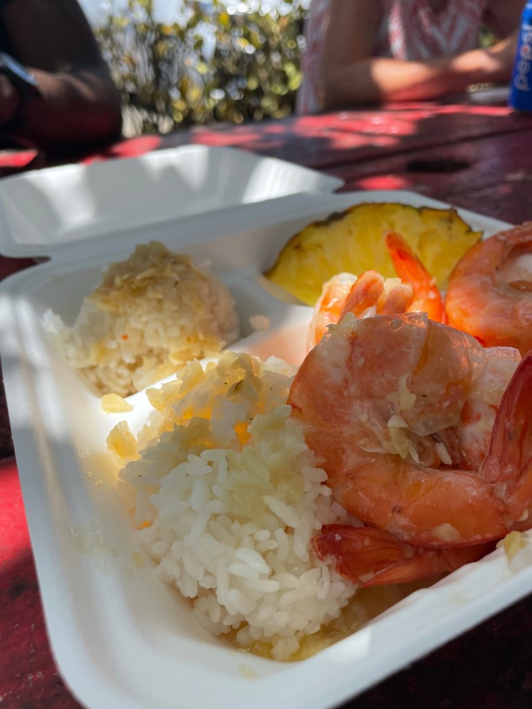 On what was I think our fourth day we went on an island tour. Our lunch stop was at a local spot called Fuji’s Shrimp. Lunch was included in our tour fee and we received a menu to select from. I ordered the butter garlic shrimp, but they also had tempura shrimp, lemon pepper, spicy garlic and even a chicken option for those who don’t eat seafood and a vegetable noodle option for the vegetarians. My butter garlic shrimp was juicy and cooked perfectly. I ate every bite and thought to myself, Renee you did great selecting this from the menu. I was very pleased to say the least. At our last stop on the island tour we visited the Dole pineapple farm where we tried Dole whip for the first time and bought a garlic parmesan covered corn on the cob.